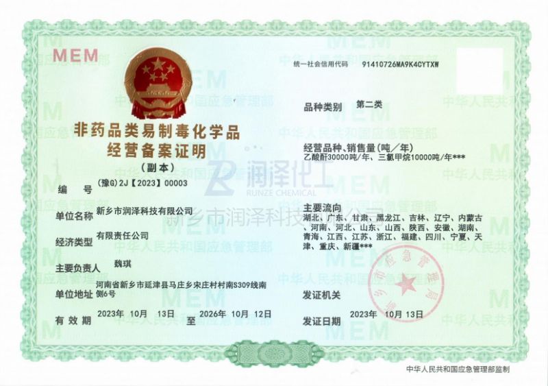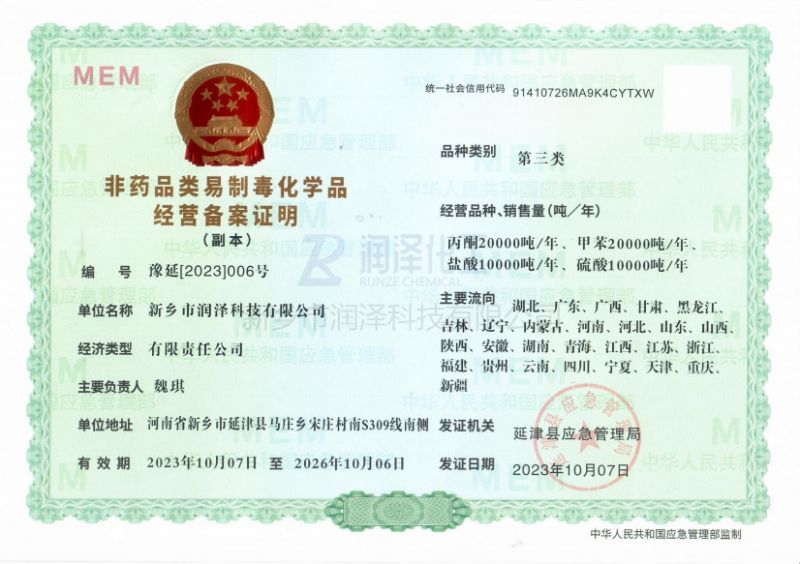 公司主要经营产品有:冰醋酸、醋酐、氯乙酸、丙酮、甲苯、三氯甲烷、二氯甲烷、乙酸乙酯、乙酸甲酯等50多个产品,产品广泛用于化工、医药、农药、印染等多个领域。新乡市润泽科技有限公司始终秉持“诚信经营、服务至 上、互惠共赢、行稳致远”的发展理念,经过多年的开拓进取,公司已形成了紧密稳固的供应渠道和销售网络,上游供应商有:兖矿集团、鲁西集团、吉林化纤集团、中国石化、义马气化、延长石化、建滔化工、山西榆社化工等多家国内大型化工生产企业。销售网络以中原地区为基础,辐射山东、江苏、浙江、安徽、湖北、山西、陕西、吉林等地区,现已成为我国中部地区较大的散化原料流通企业之一。